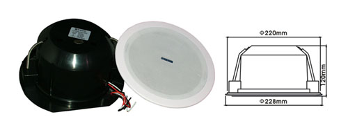 1. Rate Power : 6W. 2. Line Voltage : 100V. 3. Sensitivity(1M/1W) : 92dB. 4. Frequency Response : 110Hz ~ 13KHz. 5. Hole for Mounting : 199. 6. Dimensions : 227 * 100(mm). 7. Material : ABS resin.