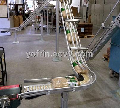 Automatic conveying system realizes flexible turning, climbing, vertically, and realizes the very radius of turn aleatoric Angle under the condition of the continuous transmission. Meanwhile, automatic conveying system is small, take up the cross section area etc, this can be used to achieve less across the floor in the wall, transmission and conveying the maximum benefits of production and solve the problem and make packaging isolation sanitary standard more conforming to GMP standards.