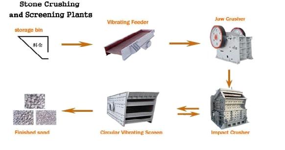 Big size stones are transferred to primary crusher through Vibrating Feeder from hopper for first crushing, then the crushed materials are transferred to Impact Crusher through Belt Conveyor for secondary crushing. The crushed materials will be transferred to the vibrating screen, and separated to different sizes. Those aggregate with suitable size will be transferred to the final product pile and those with unsuitable size will be transferred to the Impact Crusher for re-crushing. This forms a closed circuit manifold cycles. The sizes of final products will be graded and separated according to customers' requirements, and the deduster will be attached for the sake of environment protection.