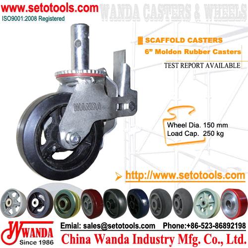 6 inch Scaffolding Casters with rubber on cast iron wheel - Wheels Design: Wheel center made of cast iron. Wheel tread made of black rubber. Roller bearing with drilled hardened steel spanner bushing and plastic side washers.Wheel axle with nut.