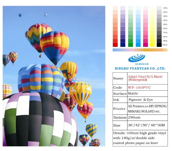 Inkjet Vinyl S/A Matte(waterproof) | WP-160PVC | Matte | 290um | 0.914 | 100um high grade vinyl with 140g/m2 double side coated photo paper as liner |