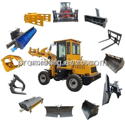 - This compact wheel loader can be equipped with optional quick hitch (quick coupler, quick attach, quick change), and this quick hitch enables this 0.8 Ton compact loader to change quickly among multiple attachments, such as hay grapple, grass grab, straw grapple, log grab, timber grapple, lumber fork, pallet fork, bale grapple, bale clamps, four-in-one bucket, multi-purpose bucket, straight snow blade, angle snow plow, diagonal snow plough V-shaped snow blade, snow bucket, V snow plow, folding snow plough, snow removal bucket, snow blower, sand spreading bucket, drum grab, barrel grapple, bucket broom, pick-up broom, street sweeper, angle broom, diagonal broom, and hydraulic flail mower, etc.