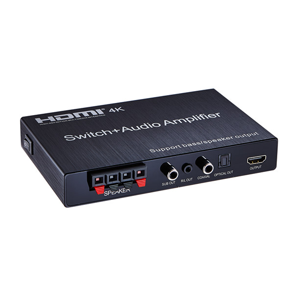 In addition, the switcher can strip audio signal from HDMI signal, output via optical fiber, coaxial, and 3.5 mm headphone.Support heavy bass,integrating Amplifier,let users enjoy the excellent audio experience.