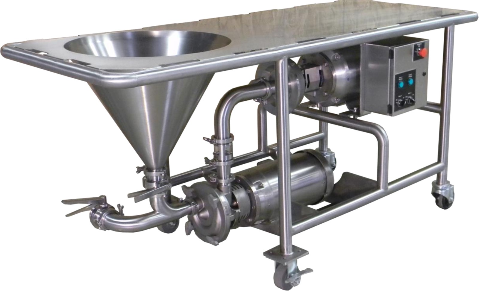 The self-priming centrifugal pump suck up the liquid from a tank, thus there is a very strong vacuum in the pipe between the pump and valve. When adjust the valve ,the material in the hopper is sucked into the pump and mixed with the liquid .And sent to the shear pump ,where the un-dissolved material sheared and mixed totally at the speed of 30m/s ,0.3 mm gap. This unit can mixing powder circularly and get a fine homogenized effect, according to the request of customer.