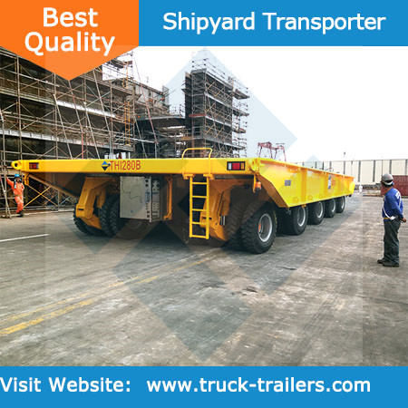 Shipyard transporter is mainly used for delivering ship block segment, ship-used machine and huge size equipment within the plant, which posed the characters of hydraulic driving system, hydraulic suspension with 3 point or 4 point support and smoothly lifting upward or downward functions. The hydraulic steering system of the shipyard transporter is independent, and it is driven by oil cylinder and is controlled by ECU, the steering models including transverse steering, central point rotation, diagonal drive in any angle within a circle of 360 degree and pivoting etc. Because of the electronic control, the transporter features maneuverability and precision as well as versatility. Also a couple of transporters can be combined freely and move simultaneously. The design of this vehicle are based on the concept of standardization and common use, serialization, fuel saving and environmental protection. The comprehensive performance of our shipyard transporter has reached the international updated level.