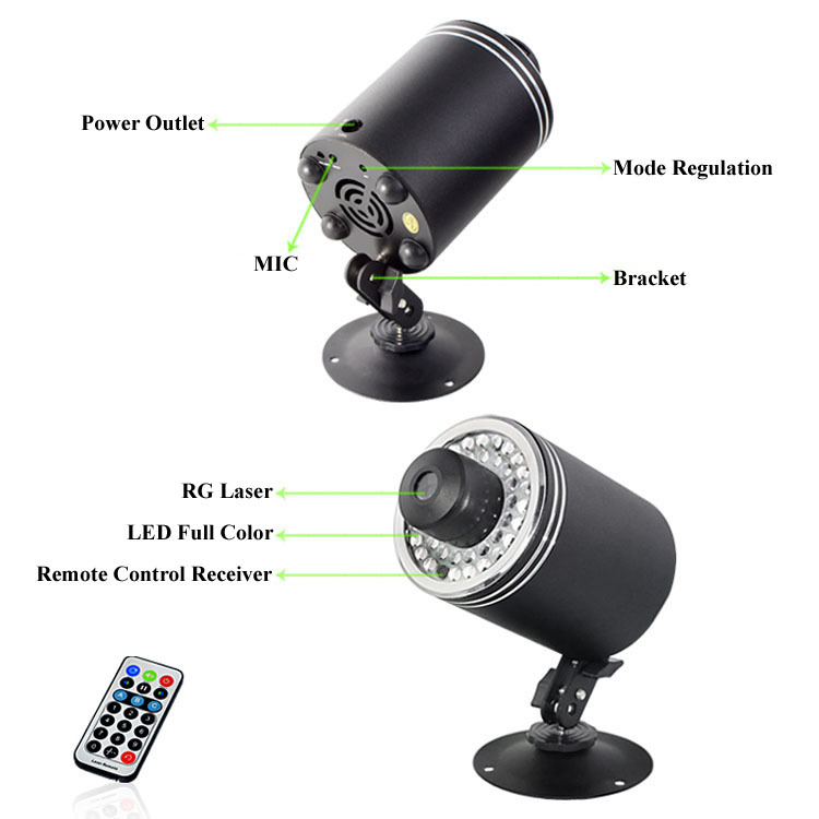Package: Laser light x 1; Remote Control(IR) ×1 (Due to logistic the Remote Controller not includ battery CR2025 3V); Power cable ×1 (USA standard plug, free plug converter for other countries); Bracket × 1; User Manual (English) ×1