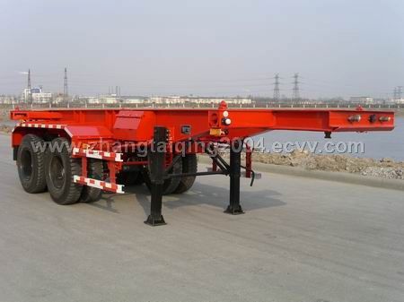 Item: 40' gooseneck skeletal container semi-trailer 2. Kerb mass: 6,000 kg 3. Loading capacity: 43,500 kg 4. Overall weight: 49,500kg 5. Overall size (about): 12350*2460*1480mm 6. Frame: Double main beam (Q245B/ST52-3) structure; 12 units twist locks loading 1 unit 40'container or 2 units 20' container or 1 unit 20' contianer place in the middle. 7. Running system: 1). Axle: 3 units of 13-ton axle 2). Suspension system: 3-axle leaf spring suspension, Leaf spring 7*16*90mm 3). Tyre: 14 units of 11.00-20 (including two spare tyre) 4). Rim: 14 units of 8.0-20 5). Kingpin (welded): 2' 6). Landing gear: 25-ton double speed linkage, "Holland" made in China 8. Braking system: Double-line air brake, WABCO brake valve, 30L chamber on the Two front axle, 30/30L chamber on the last axle. 9. Electrical System: 24V, seven pin, national standard 10. Other: 1). Winch-type spare tyre holder: 2 units 2). Mudguard 3). Underrun crash side barrier 4). One set of driver's tool in the tool box: One tyre spanner, one gudgeon bushing and one cranking bar. 11. Surface treatment: (1) Whole vehicle under sand blasting (2) Primary coat (3) Final coat color as requirement 12. 2 units in one package, 54 CBM totally